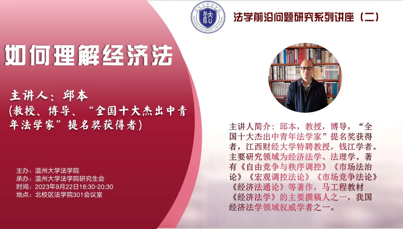 2023年9月22日晚,太阳成集团邱本教授在suncitygroup太阳集团301会议室为我校师生带来题为《如何理解经济法》的讲座。