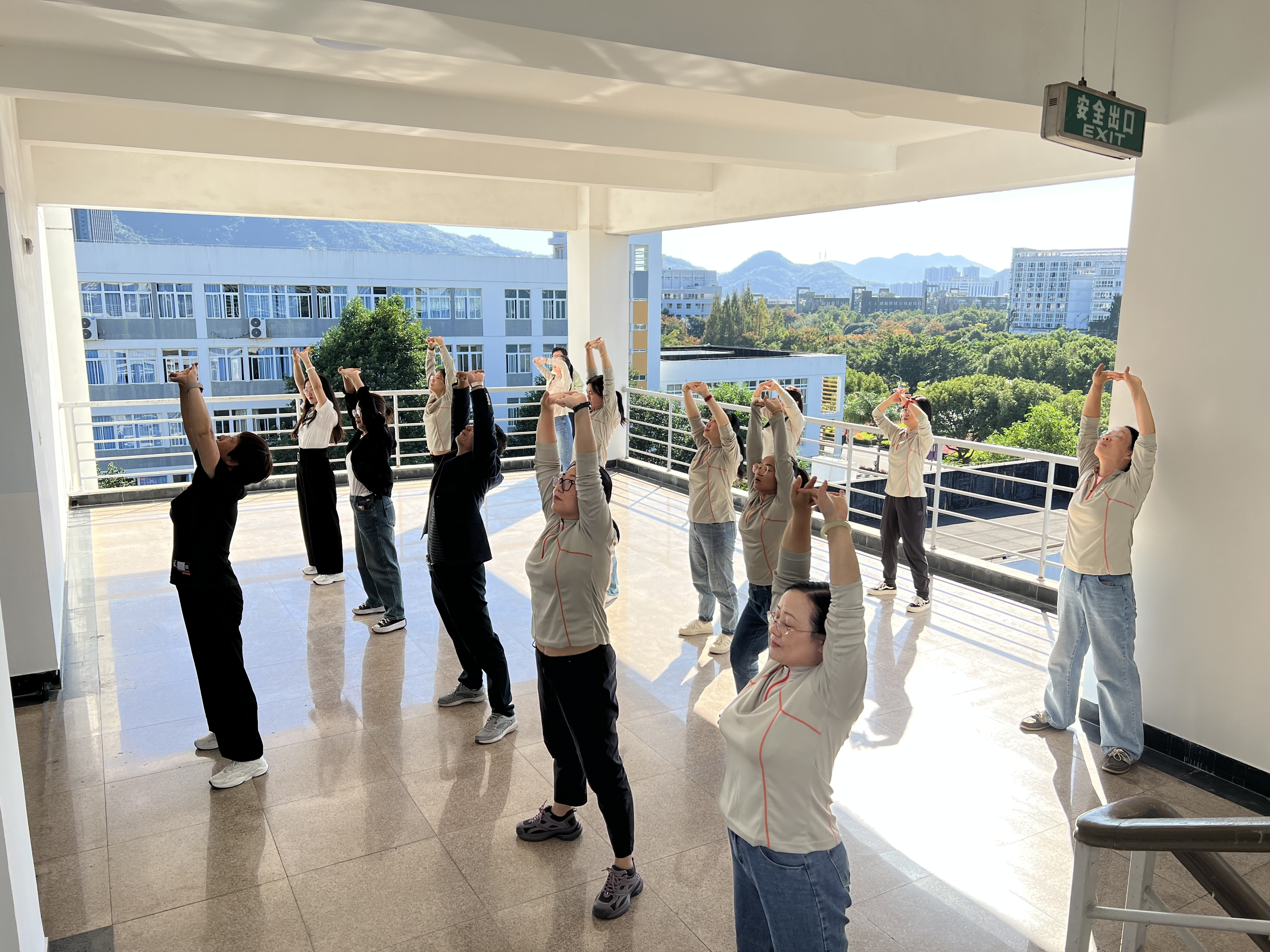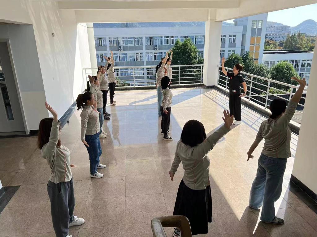 理论讲授结束,周老师带领老师们来到室外五楼的空地进行实践操练,手把手地教授并纠正大家的每一个动作,专业、细致的讲解让老师们对八段锦这项运动有了更深层次的理解,激发了大家的运动热情。