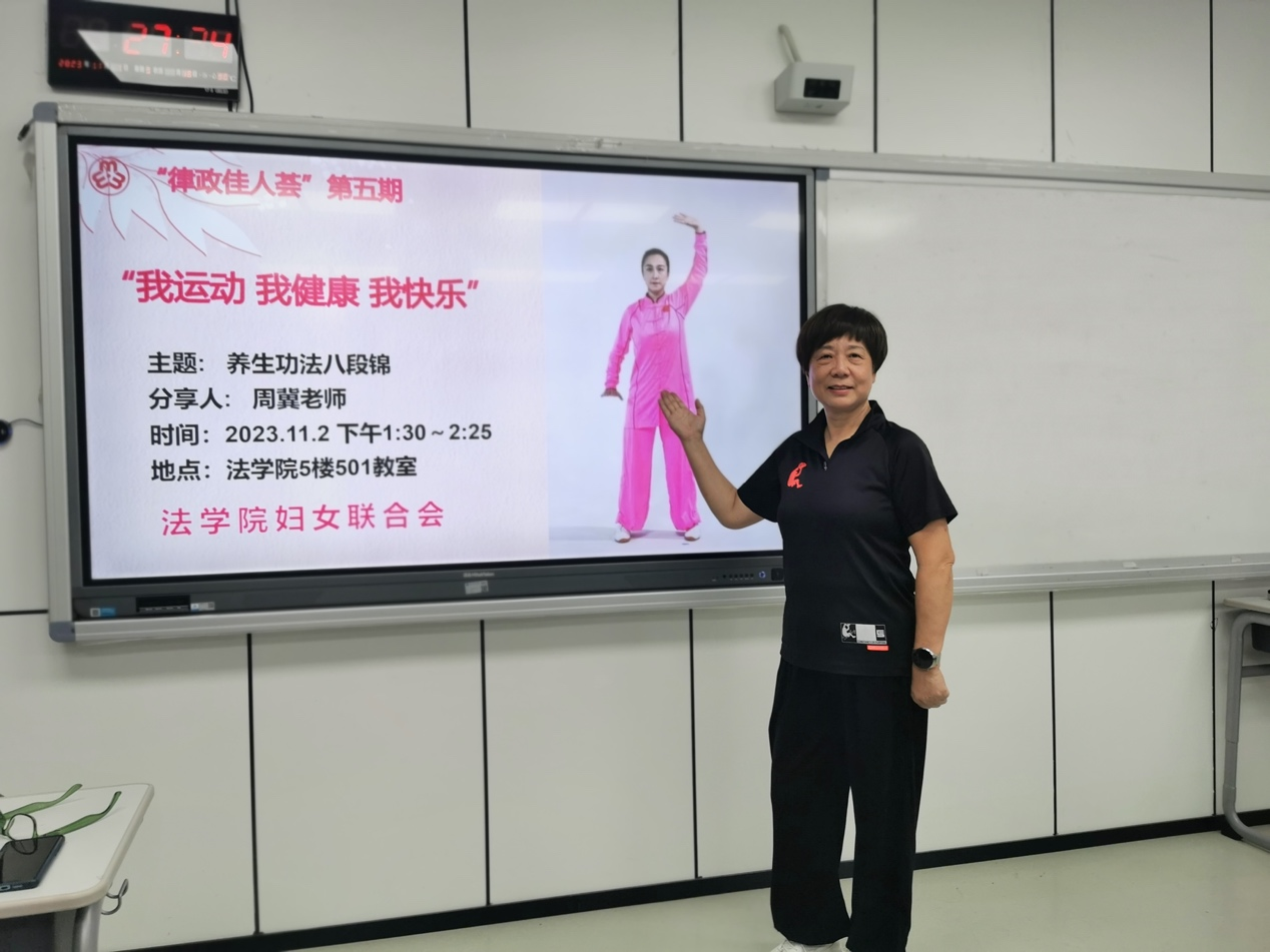 11月1日下午,suncitygroup太阳集团“律政佳人荟”第五期在2号楼501教室举行。本期活动的主题是“我运动、我健康、我快乐”,特别邀请到周冀老师和大家分享健身气功“八段锦”。