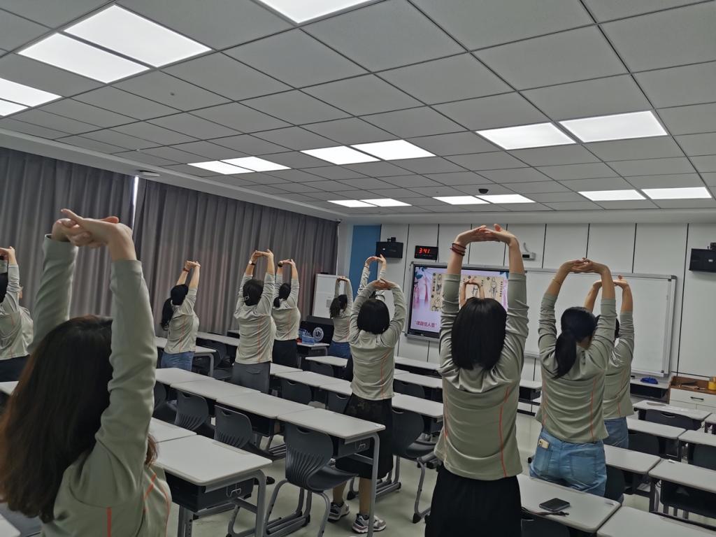 活动开始,周冀老师先带领大家在教室做运动之前的身体拉伸,然后细心给大家讲解八段锦的好处和动作要领。她认为,八段锦属于有氧运动,最大的好处在于简单、有效、安全,只需要用一点点的体力,就能内炼精神脏腑气血,外炼经脉筋骨四肢,通达全身。她特别指出,练习八段锦一定要牢记的身型要点是“虚灵顶劲,沉肩坠肘,含胸拔背”。