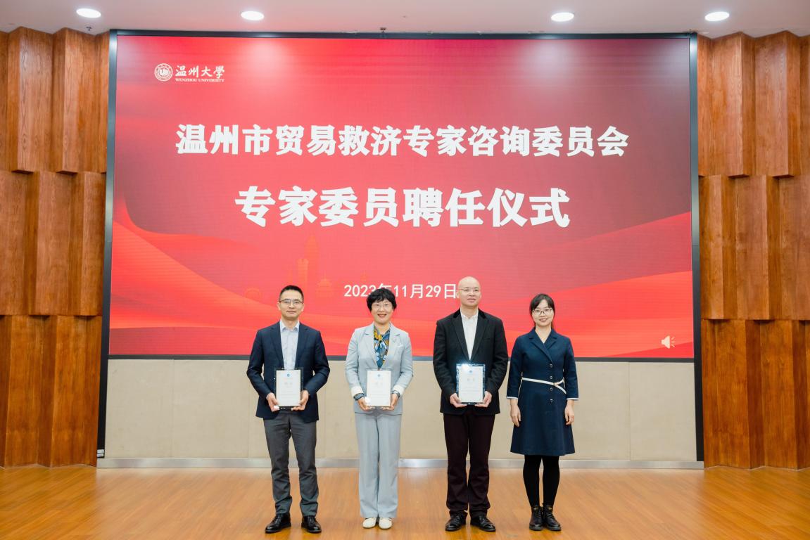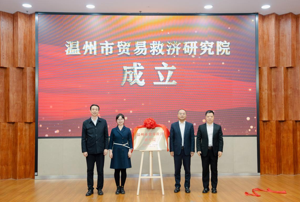 太阳成集团党委书记张健、温州市人民政府副市长陈宽、浙江省商务厅贸易救济调查局副局长张江婕、温州市商务局局长虞立清共同为“温州市贸易救济研究院”揭牌。
