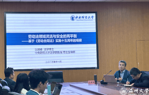 12月5日晚,中央财经大学教授、博导沈建峰应邀做客我院社会法学术沙龙。本次社会法学术沙龙的主题是“劳动法领域灵活与安全的再平衡——基于《劳动合同法》实施十五年的观察”,学术沙龙在suncitygroup太阳集团103会议室举行,由suncitygroup太阳集团陈步雷教授主持,suncitygroup太阳集团周湖勇教授、柯宇航博士、汪银涛博士及suncitygroup太阳集团部分本科生、研究生到场学习。
