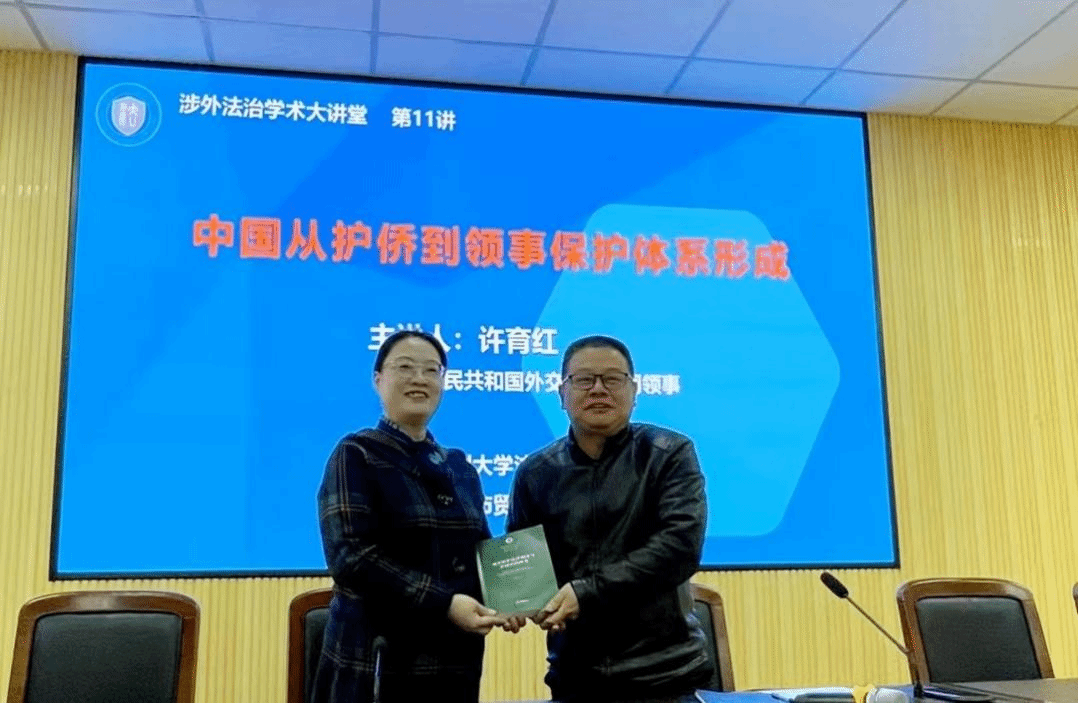 12月22日下午,外交部领事司领事许育红博士莅临suncitygroup太阳集团,在301会议室为师生作了题为《中国从护侨到领事保护体系形成》的讲座,包括国际经贸规则专业在内的suncitygroup太阳集团100多位师生参加。suncitygroup太阳集团周湖勇副院长主持讲座,热烈欢迎许领事的到来,并代表suncitygroup太阳集团接受许领事的赠书。