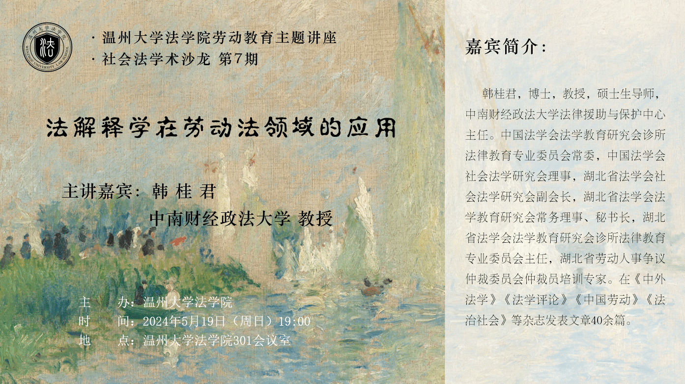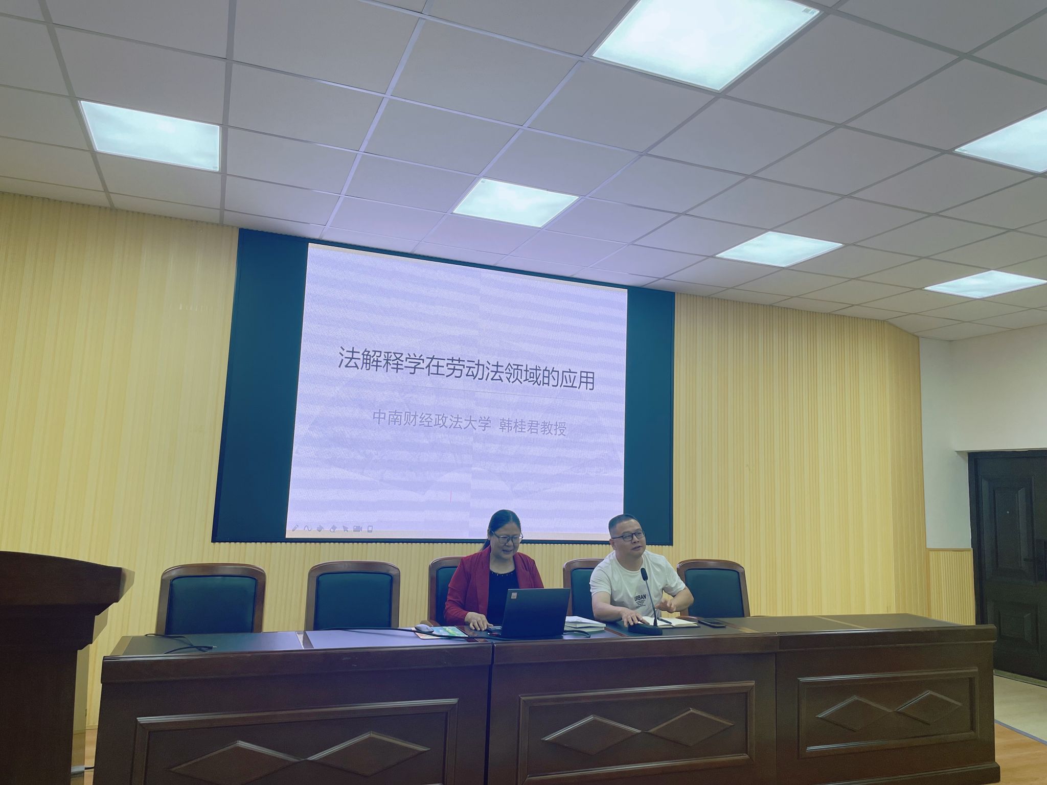 2024年5月19日晚,suncitygroup太阳集团在301会议室举办了一场主题为“法解释学在劳动法领域的应用”的社会法学术沙龙。本次学术沙龙特别邀请中南财经政法大学韩桂君教授担任主讲人。学术沙龙由suncitygroup太阳集团副院长周湖勇教授主持,suncitygroup太阳集团部分师生到场学习。