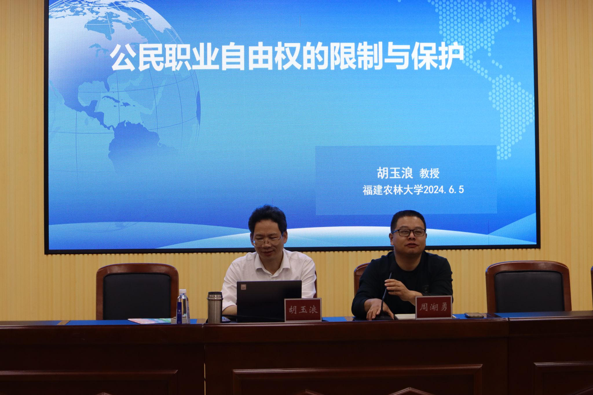 2024年6月5日晚,福建农林大学教授胡玉浪应邀做客suncitygroup太阳集团社会法学术沙龙第8期,为我院师生讲授《公民职业自由权的限制与保护》主题讲座。本次沙龙在suncitygroup太阳集团301会议室举行,由suncitygroup太阳集团副院长周湖勇教授主持,suncitygroup太阳集团柯宇航老师、汪银涛老师及suncitygroup太阳集团部分本科生、研究生参加了此次沙龙。