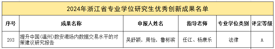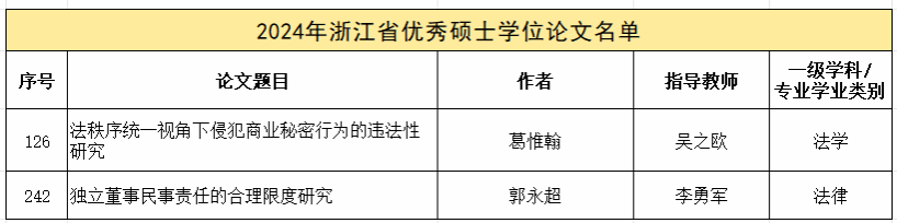 据悉,此次优秀学位论文评选是全省首次将学术学位论文和专业学位论文分开进行独立评选,在本次评选中,我院成功获评法学、法律硕士学位优秀论文各1篇,在连续两年斩获学术学位优秀论文的基础上,实现了专业学位赛道零的突破。在同期公布的2024年浙江省专业学位研究生优秀创新成果名单中,全省A类成果217项,其中,法律硕士学位类别仅2项,我院成功获评1项。此次获奖,充分体现了我院在专业学位研究生实践创新能力培养上的扎实成效,是我院在研究生分类培养、分类发展方面取得的又一重要阶段性成果。