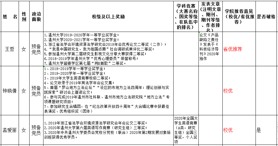根据《太阳成集团研究生优秀毕业生评选办法》(行政〔2019〕225号)(附件1)文件精神,学院组织开展了2021届研究生省、校级优秀毕业生的预评工作。我院名额:省优1人、校优1人。通知发出后,有5名学生报名参评。其中孟爱丽同学获得全国大学生英语竞赛三等奖,破格推荐评为校级优秀毕业生,不占用学院名额。学院审核申报者的材料,由太阳成集团委员会根据学生的学习成绩、获奖、科研成果、平时综合表现等情况投票,决定推荐王哲参加省优毕业生评选、推荐钟晓倩评为校优毕业生。具体由学校研究生工作部复审后公示最终的评选结果。现将学生的基本信息公示如下: