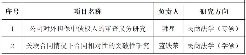 根据《suncitygroup太阳集团优秀研究生学位论文培育项目实施方案》的规定,由学生自愿申请并提交相关材料,经学院学术委员会评定,以下《公司对外担保中债权人的审查义务研究》等2个项目评定为院级学位论文培育项目,现将评审结果予以公示: