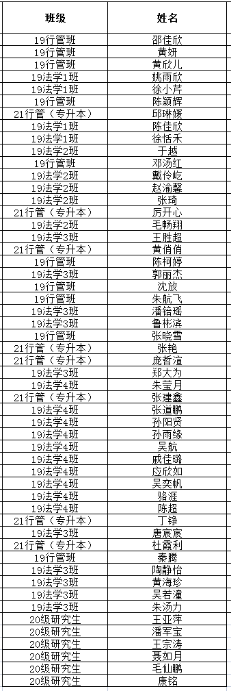 为进一步加强我院学风建设,激励学生在校勤奋学习,充分调动我院应届本科生考研和研究生考博的积极性和主动性,根据《太阳成集团法政校友基金奖励实施办法》,现拟对2023届考取硕士研究生、博士研究生的毕业生给予奖励。现对奖励名单公示如下: