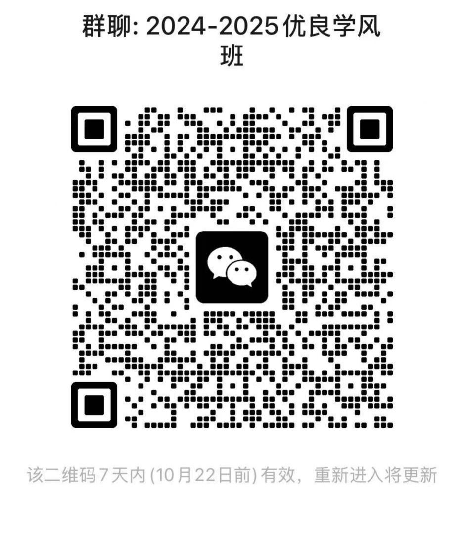 注:学习标兵个人简介和优良学风班简介范本请在各自申请页面下方的“材料下载”中下载。优良学风班申报表(附件2)的电子版及相关支撑材料请于10月24日晚20:00前以压缩包的形式(班级+申报优良学风班)发送至邮箱1434968506@qq.com;学习标兵申报表(附件2)的电子版及相关支撑材料请于10月24日晚20:00前以压缩包的形式(班级+姓名+申报学习标兵)发送至邮箱3390523090@qq.com。优良学风班和学习标兵申报表的纸质版请于10月24日16:30前交学院一楼事务大厅邱老师处,逾期不予申请。请有意愿申报优良学风班和学习标兵的同学加入下面的群聊,后续相关事项的通知和答疑会在本群进行。