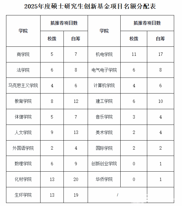 (一)拟推荐项目分配。根据各学院在校研究生人数的5%测算硕士生创新基金拟推荐项目,具体各学院硕博创新基金拟推荐项目分配见下表:
